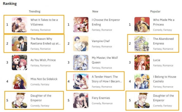 웹소설이 원작이며 이후 웹툰으로 제작되었고 8월 1일부터 시즌 2 연재를 시작합니다. <황제의 외동딸>은 종이책 부수로만 15만 부가 팔렸으며 웹툰으로도 만들어졌으며 해외시장까지 진출했습니다. 북미, 중국, 일본에 서비스를 시작한 2017년에는 <황제의 외동딸>, <이 세계의 황비> 2개의 작품만으로 4억 원의 매출을 올리기도 했습니다. <황제의 외동딸>은 중국 텐센트의 2017년 올해의 웹툰 2위, 일본 코미코 올해의 신작 1위를 차지했으며 <이 세계의 황비>는 2위에 오르기도 했습니다.