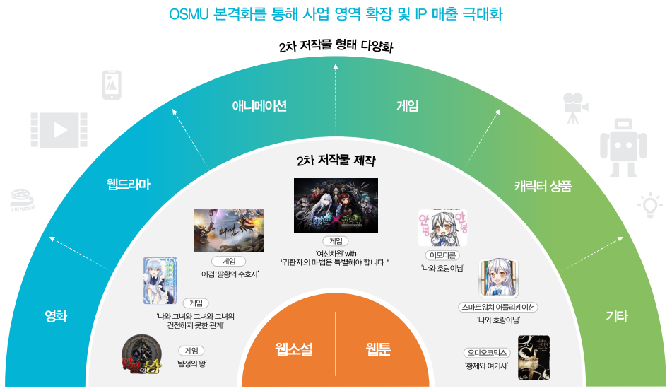 대표작품으로는 최근 국내외 가장 핫한 <나 혼자만 레벨업>, <황제의 외동딸>, <이 세계의 황비>, <버림받은 황비>, <그녀가 공작저로 가야 했던 사정> 등이 있습니다. <나 혼자만 레벨업>은 단일 IP로만 국내에서 누적 조회수 4.3억 건 이상, 누적 독자 수(웹소설, 웹툰 합산) 500만 명을 기록했으며, 국내외 누적 매출액은 300억 원에 달하는 작품입니다.