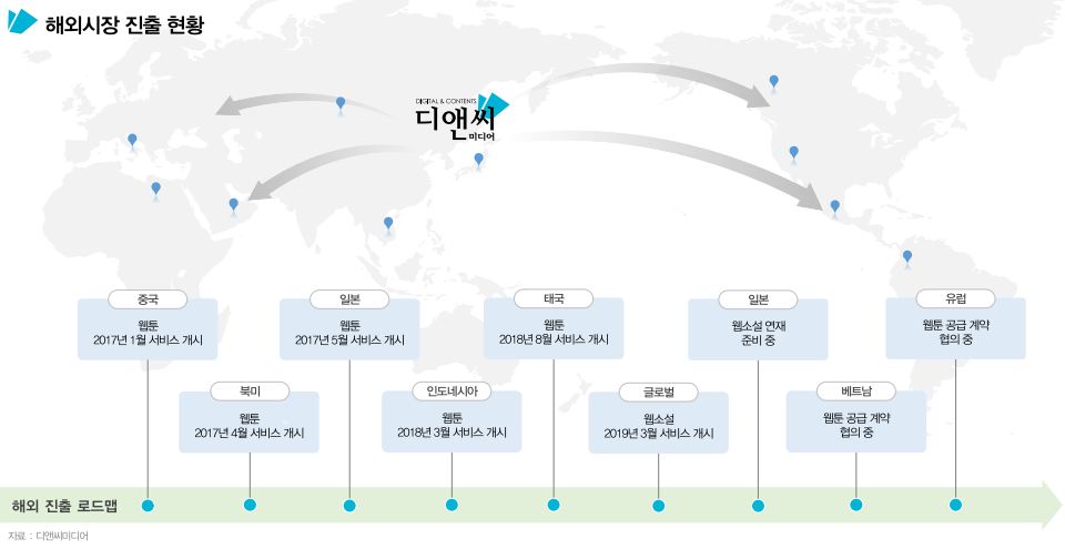 디앤씨미디어의 콘텐츠는 국내뿐만 아니라 해외에서도 선풍적인 인기를 끌고 있습니다. <나 혼자만 레벨업>은 미국 시장에서도 일본의 유명 만화 <원피스>를 제치는 기염을 토하기도 했으며, 미국의 한 온라인 만화 사이트에서 월간 14만 회가 넘는 조회수를 기록하며 1위에 올랐으며 2위는 <나 혼자만 레벨업>의 원작인 소설 버전이 차지하기도 했습니다. <나 혼자만 레벨업>은 19년 중국 최대 웹툰 플랫폼 콰이칸에서도 1위를 기록했으며, 카카오재팬 만화 플랫폼인 픽코마(일본 내 2위)에서도 1위를 달리고 있습니다.