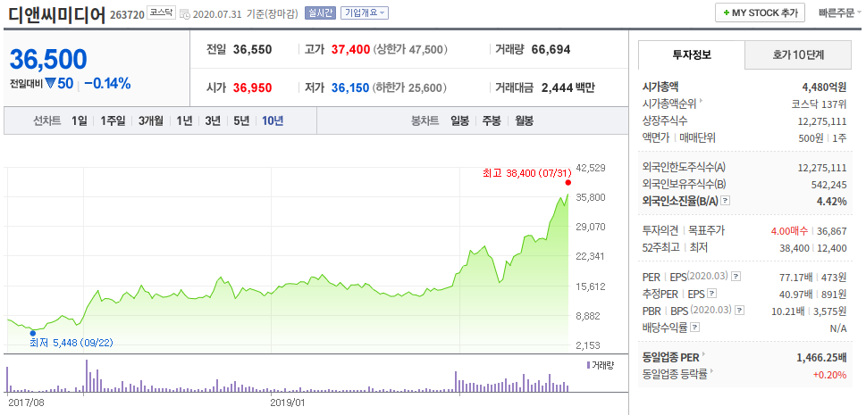 디앤씨미디어는 상장 후 2018년 <황제의 외동딸> 인기에 힘입어 상승을 보여준 후 박스권을 유지하다가 웹툰 시장의 성장과 기대감, 해외 시장에서의 성공 등으로 다시 상승한 후 코로나 이후 폭등하는 모습을 보여주고 있습니다. 코로나 19로 인한 반사이익, 2분기 실적 기대감, <나 혼자 레벨업 시즌2> 기대감, 해외 성과, 카카오페이지의 성장 등에 힘입어 신고를 갱신하고 있는 모습을 보여주고 있습니다.