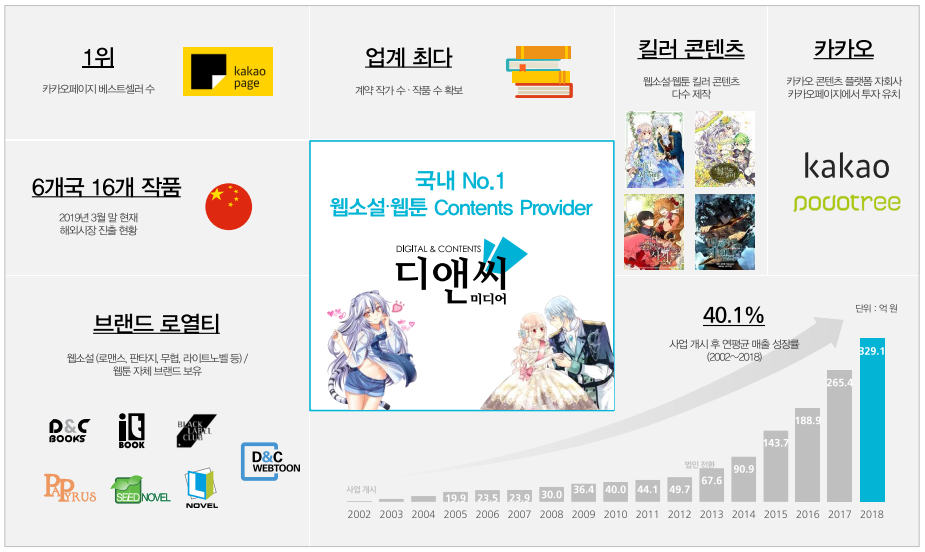 코로나 19로 인해 다수의 웹툰 관련 기업들이 실적 상승과 함께 주목을 받고 있는데 그 중심에 서있는 회사가 바로 디앤씨미디어입니다. 언택트로 최고의 주목을 받고 있는 카카오의 카카오페이지와 손잡고 콘텐츠를 공급하고 있는 디앤씨미디어는 웹소설 및 웹툰 전문 콘텐츠 공급업체로서 콘텐츠를 제작, 출판, 유통하는 사업을 영위하고 있습니다.