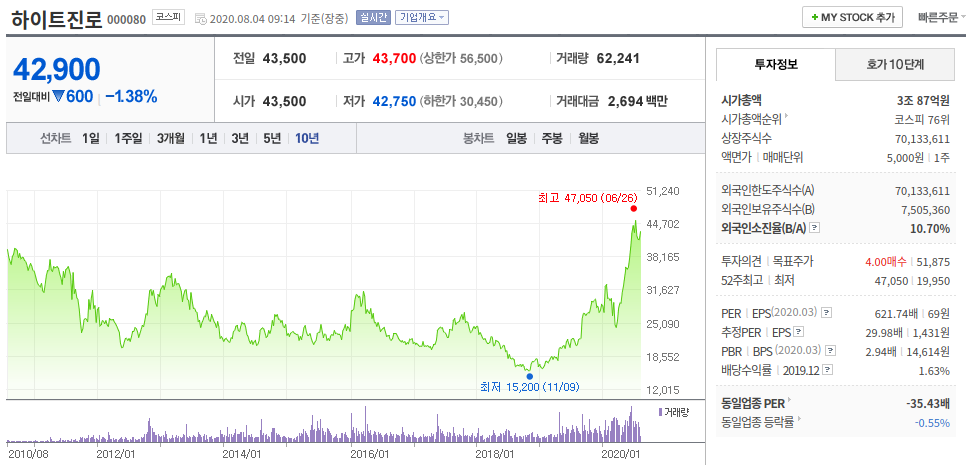 하이트 진로는 대표적인 국산 주류회사로 테라, 진로를 앞세워 국내 맥주회사 내에서도 점유율을 다시 찾아오고 있는 상황입니다. 일본 불매운동을 기점으로 일본 맥주 점유율은 급감하게 되었는데 아사히 기준으로 2018년 7,830만 달러(약 934억 원)를 수입한 반면 2020년 1~5월 기준으로 244만 달러(약 29억 원)를 수입하였습니다. 이에 따른 반사 이익을 볼 것으로 전망되어 관련주로 분류되고 있습니다. 하이트진로, 하이트진로 우, 하이트진로 홀딩스까지 있으니 참고하시면 좋을 듯합니다.