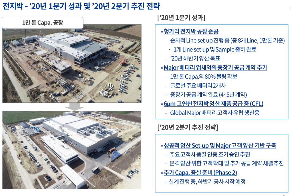 두산 솔루스의 1분기 보고서에 따르면 헝가리 영업법인 DCE(Doosan Corporation Europe Kft.)이 글로벌 배터리 제조업체와 연 공급물량 기준 8천 톤 규모의 전기차 배터리용 전지박 장기공급계약을 체결하였으며 20년 3월 체결한 두 번째 장기공급계약의 계약기간은 2021년부터 2024년까지 4년으로 계약금액 1,000억 원대 규모입니다. 2 차 전지용 동박(전지박) 사업에서 아직은 본격적인 매출이 발생하고 있지 않아 지켜볼 필요가 있어 보입니다.