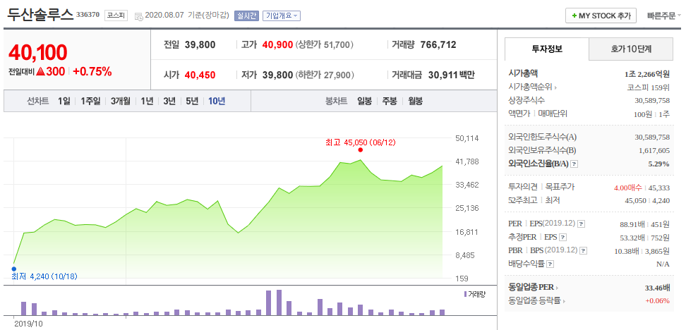 두산 솔루스는 상장 이후부터 꾸준히 우상향 하는 모습을 보여주고 있습니다. 코로나 19로 인해 잠시 주춤했으나 현재 전 고점을 향해 달려가고 있습니다. 2차 전지가 엄청난 주목을 받으면서 관련주들이 폭등하고 있는 현 상황에서 2차 전지용 동박(전지박) 매출을 아직 없다시피 한 두산 솔루스의 주가는 어디까지 갈지 궁금하게 만듭니다.