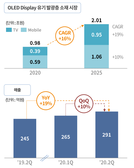 두산 솔루스의 첨단소재 사업부는 OLED 소재 및 천연화장품, 원료의약품 및 건강기능식품용 바이오 소재 사업을 영위하고 있습