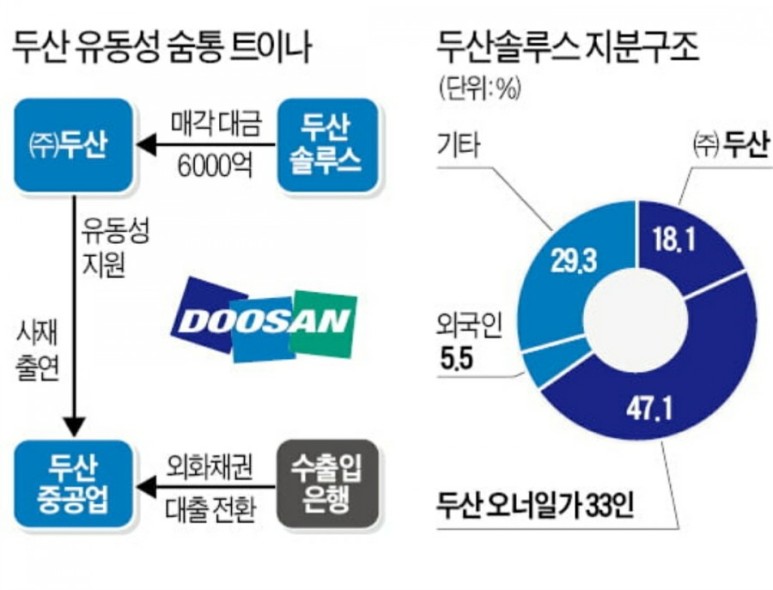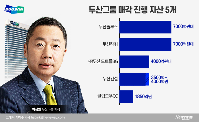 두산중공업이 유동성 위기에 빠져 KDB 산업은행과 한국 수출입은행으로부터 3조 6천억 원의 자금을 수혈한 데 따른 경영 정상화 방안의 이행 과정으로 두산그룹은 보유자산과 계열사 매각을 진행 중입니다. 두산은 3조 원을 마련해야 하며 이 가운데 1조 원은 2020년 안에 준비해야 돼서 자산 매각에 속도를 올리고 있습니다. 클럽모우 CC, 두산타워 등 그룹이 보유한 부동산 매각과 함께 두산그룹의 신성장동력으로 육성하려 했던 두산 솔루스를 내놓았으며 두산 모트롤 BG, 두산 건설도 매각이 진행 중입니다. 이외에도 두산 인프라코어 지분 매각을 검토하고 있으며 3조 원 이상을 회수해야 하는 만큼 두산 밥캣 매각도 가능성이 있는 것으로 여겨지고 있습니다.