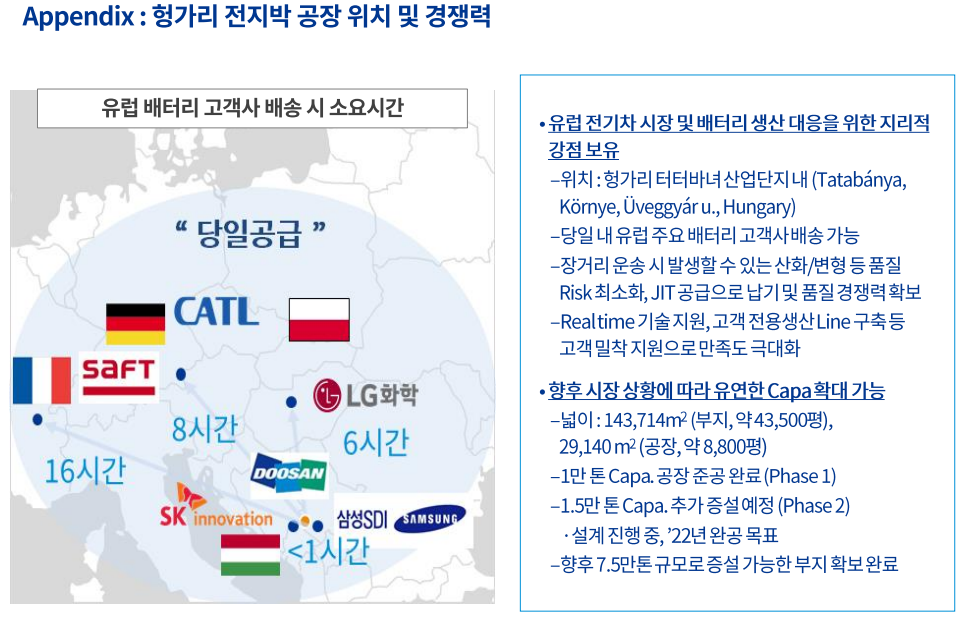 유럽 내 전기 자동차 시장의 높은 성장률이 예상됨에 따라 국내외 주요 2차 전지 업체들의(LG화학, 삼성 SDI, SK이노베이션, Panasonic, CATL 등) 유럽 진출 및 신규 2차 전지 업체들(Northvolt, SAFT 등) 역시 공격적으로 시장 진입 중에 있으며, 이는 주요소재인 전지박의 수요 증가로 이어지고 있습니다. 그러나 전지박 공장의 대다수가 아시아 지역에 위치하고 있어 유럽 역외에서 수입 시 장시간의 운송 기간이 더 해져 수급 유연성 저하와 물류/관세 비용의 증가가 예상됩니다. 특히, 수명이 짧은 전지박 특성상 산화 등의 품질 부분에서 취약점을 가지고 있어 두산 솔루스는 유럽 유일의 동박(전지박) 생산 기지로서 현지 공급을 통해 이러한 리스크를 줄이고 고객에게 차별화된 벨류 제공이 가능할 것으로 보입니다.