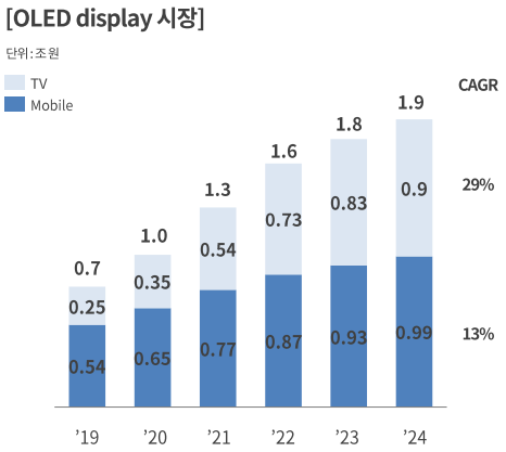 니다. 현재 휴대폰용 OLED Display 적용률은 19년 35%에서 24년 64%까지 증가할 것으로 전망하고 있으며 OLED는 스마트폰뿐 아니라 TV, 커머셜, 자동차, 조명 등 다양한 부문으로 적용이 확대될 예정입니다. 당장 자동차 산업만 보아도 각종 모델과 디자인 콘셉트카 등에서 쉽게 OLED 적용 사례를 확인할 수 있습니다. 아우디의 버추얼 익스테리어 미러, 벤츠의 OLED 인포테인먼트 시스템, 도요타 외부 OLED 디스플레이, 파나소닉 고성능 OLED 소재까지 단적인 예이지만 모든 글로벌 기업들이 앞다투어 OLED를 채용하고 있습니다.