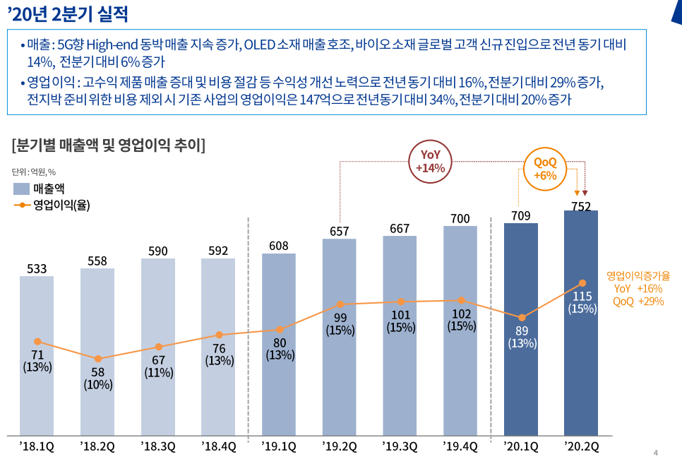 두산 솔루스는 2분기 매출 709억 원(전년 동기 대비 +14%, 전기 대비 +6%), 영업이익 115억 원(전년 동기 대비 +17%, 전기 대비 +29%)으로 시장 컨센서스를 상회하는 실적을 내놓았습니다. PCB용 동박 부문과 OLED가 매출 성장에 기여한 것으로 보입니다. 동박 부문의 경우 5G 기지국, 데이터 센터 용 하이엔드 동박의 수요 증가로 매출 증가 및 수익성이 개선된 것으로 보입니다. OLED 부문의 경우 갤럭시 보급형 모델에 OLED가 채택되며 국내 주요 고객사 점유율 상승 및 중화권 수요 증가로 매출이 증가하였습니다. 바이오 부문은 해외 신규 고객사가 확보와 코로나 19 여파로 면역력 관련 제품 수요가 늘면서 매출이 확대되었습니다.