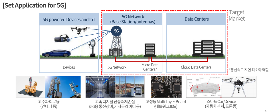 동박 사업은 2차 전지용 동박(전지박)뿐만 아니라 인쇄회로기판(PCB)용 동박도 견조한 성장을 보일 것으로 예상됩니다. PCB용 동박 제품 중 고부가 제품(5G 장비에 탑재되는 High frequency와 Low loss, 반도체 패키징용 극박 등)은 18~25년 12% 연평균 성장률을 보이며 견조한 성장이 전망되며, 특히 5G용 소재로 사용되는 Low loss, High frequency 제품의 성장이 시장을 주도할 것으로 보입니다. Low loss의 경우 18~25년 18%의 연평균 성장률, High frequency의 경우 18~25년 연평균 성장률 15%의 고성장이 전망됩니다. Low loss, High frequency 제품에 대한 동박사업의 시장점유율은 60% 이상으로 시장을 선점하고 있으며, 5G의 본격 도래에 따라 각 국의 수요가 지속적으로 늘어 동 시장에서 더욱 확고한 자리를 차지할 것으로 전망됩니다. 현재 두산 솔루스의 PCB용 동박은 매출의 대부분을 차지하고 있습니다.
