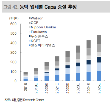 전지박 제조는 대규모 설비가 필요한 장치 산업인 동시에 화학물(전해액, 첨가제 등) 관리(전해액 농도 유지, 이물질 관리) 및 일정한 두께의 얇은 동박 생산을 위한 공정관리 능력이 반드시 필요합니다. 이는 단기간에 확보하기 어렵고 오랜 기간의 노하우를 확보한 업체만 보유할 수 있는 기술이라 볼 수 있습니다.