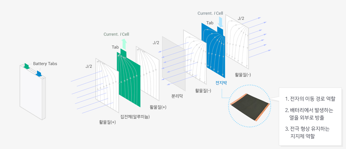 2차 전지용 동박(전지박)은 현재 가장 각광받고 있는 2차 전지 소재 산업이며, 두산 솔루스 역시 동박(전지박) 사업을 성장 동력으로 삼고 있습니다. 전기차에 들어가는 동박(전지박)은 2차 전지의 음극 부분에 씌우는 얇은 구리박으로 배터리 음극 활물질(전지의 전극 반응에 관여하는 물질)에서 발생하는 전자가 이동하는 경로를 의미합니다. 전지박은 내부에서 발생하는 열을 외부로 방출시킬 뿐 아니라 전극의 형상을 유지하는 지지체 역할도 수행해 전기차용 배터리를 구성하는 핵심 부품으로 꼽힙니다.