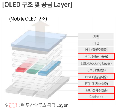 OLED 산업은 첨단 소재업 특성상 고성능/고신뢰성 제품을 확보한 업체 중심으로 독과점 경쟁구도를 형성하고 있습니다. RGB 등 발광층과 IP로 보호되는 특수 공통층 등 하이엔드 소재 시장이 여기에 해당합니다. 하이엔드 소재는 보통 2년 주기로 패널사에서 평가하여 효율/수명 등 핵심 스펙이 뛰어난 제품을 승인하며, 승인된 제품은 신규 모델 개발 전까지는 대체가 불가능합니다. 핵심 기술 경쟁력은 고객이 원하는 특성 구현을 위한 분자 설계 기술 및 합성 노하우로, 두산 솔루스는 현재 가장 기술적 구현이 어려운 블루(B) 소자의 효율을 보완하는 독보적인 공통층(HBL) 기술 노하우를 보유하고 있습니다.