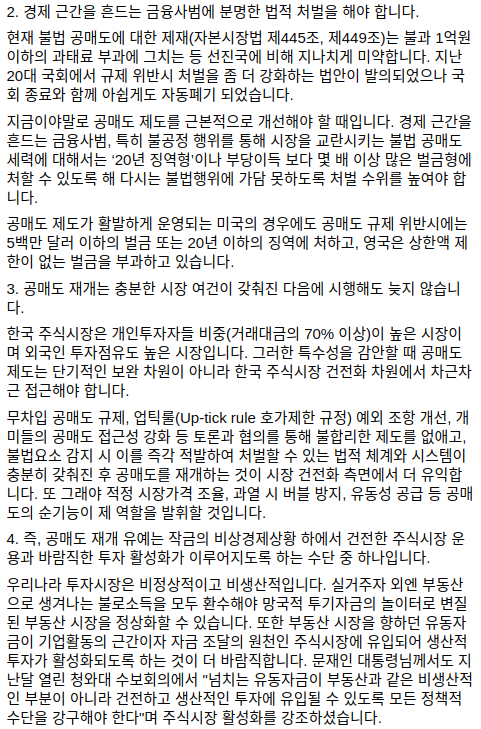 그는 “한국 주식시장은 개인투자자들 비중(거래대금의 70% 이상)이 높은 시장이며 외국인 투자 점유도 높은 시장입니다. 무차입 공매도 규제, 업틱룰(Up-tick rule·호가 제한 규정) 예외 조항 개선, 개미들의 공매도 접근성 강화 등 토론과 협의를 통해 불합리한 제도를 없애야 합니다”라고 덧붙이며 "공매도 재개는 충분한 시장 여건이 갖춰진 다음에 시행해도 늦지 않습니다"라고 입장을 밝혔습니다.